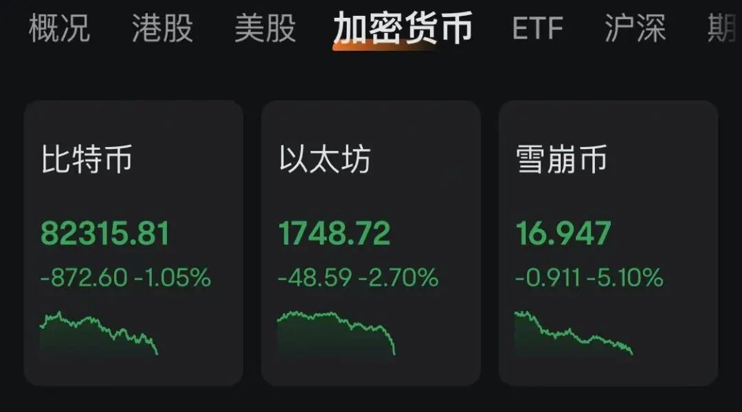 除了比特币之外,以太坊跌超2%,狗狗币跌超3%,特朗普币跌超4%。雪崩币跌逾5%。