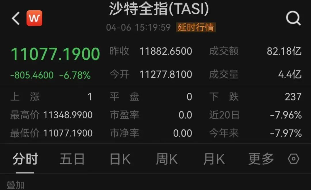 值得注意的是,今日率先开盘的沙特股市暴跌,截至收盘跌近7%。分析认为,特朗普关税影响和原油暴跌是沙特股市大跌的重要因素。